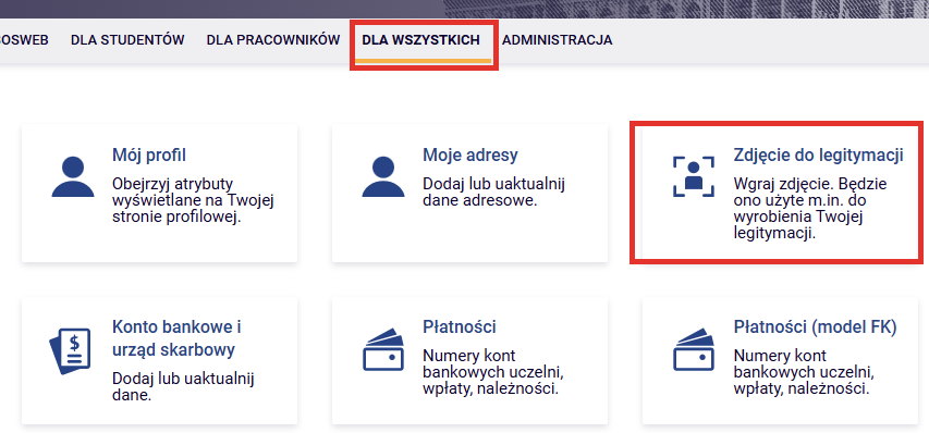 – student po zalogowaniu do USOSweb przechodzi do zakładki DLA WSZYSTKICH -> Zdjęcie do legitymacji